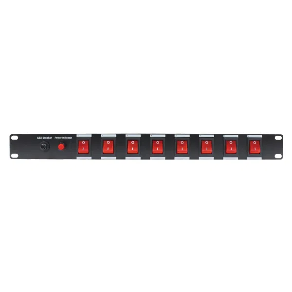 A rack mount unit allowing easy on/off power control of up to 8 channels of lighting fixtures. The illuminated rocker switches make this unit ideal for both portable and fixed installation applications.